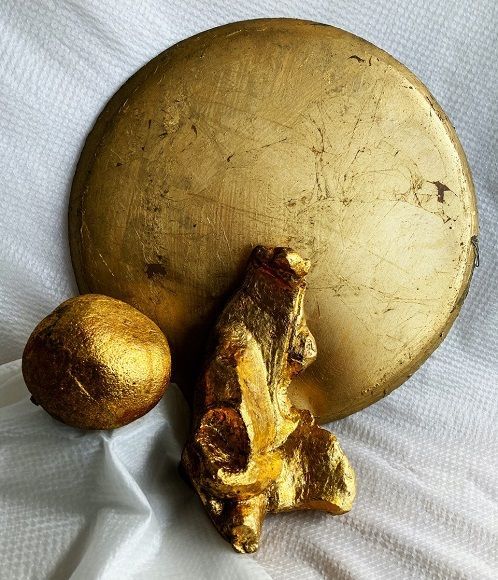 „Schlagmetall“ das es in verschiedenen Ausführungen gibt. Objekte ,Silhouetten, verschiedene Oberflächen und Untergründe stehen, für die ersten Vergoldungsversuche, zur Verfügung. Jede(r) Teilnehmer*in erhält die Arbeitsmaterialien zur Vergoldung im Kurs.
